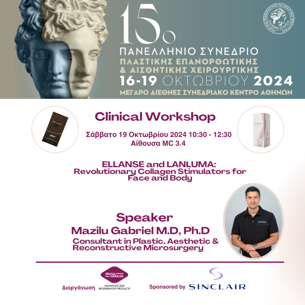 • Κλινικό Φροντιστήριο το Σάββατο 19 Οκτωβρίου και ώρες 10:30 – 12:30 με ομιλητή τον ιατρό Mazilu Gabriel M.D, Ph.D, Consultant in Plastic, Aesthetic & Reconstructive Microsurgery και τίτλο «ELLANSE and LANLUMA: Revolutionary Collagen Stimulators for Face and Body».